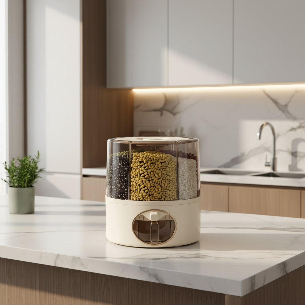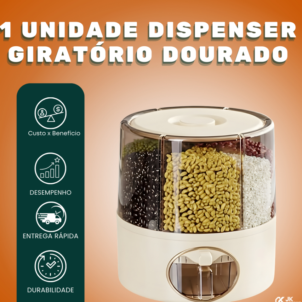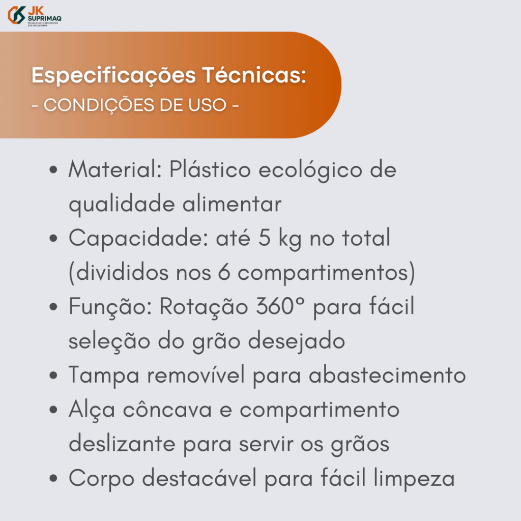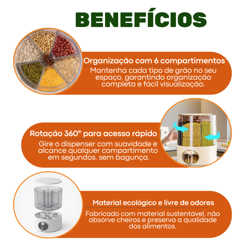A GrainBox Elite™ é o dispenser rotativo 360º com 6 compartimentos que une design moderno, vedação hermética e praticidade absoluta em um único produto elegante e funcional.