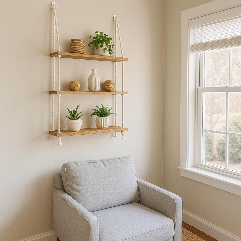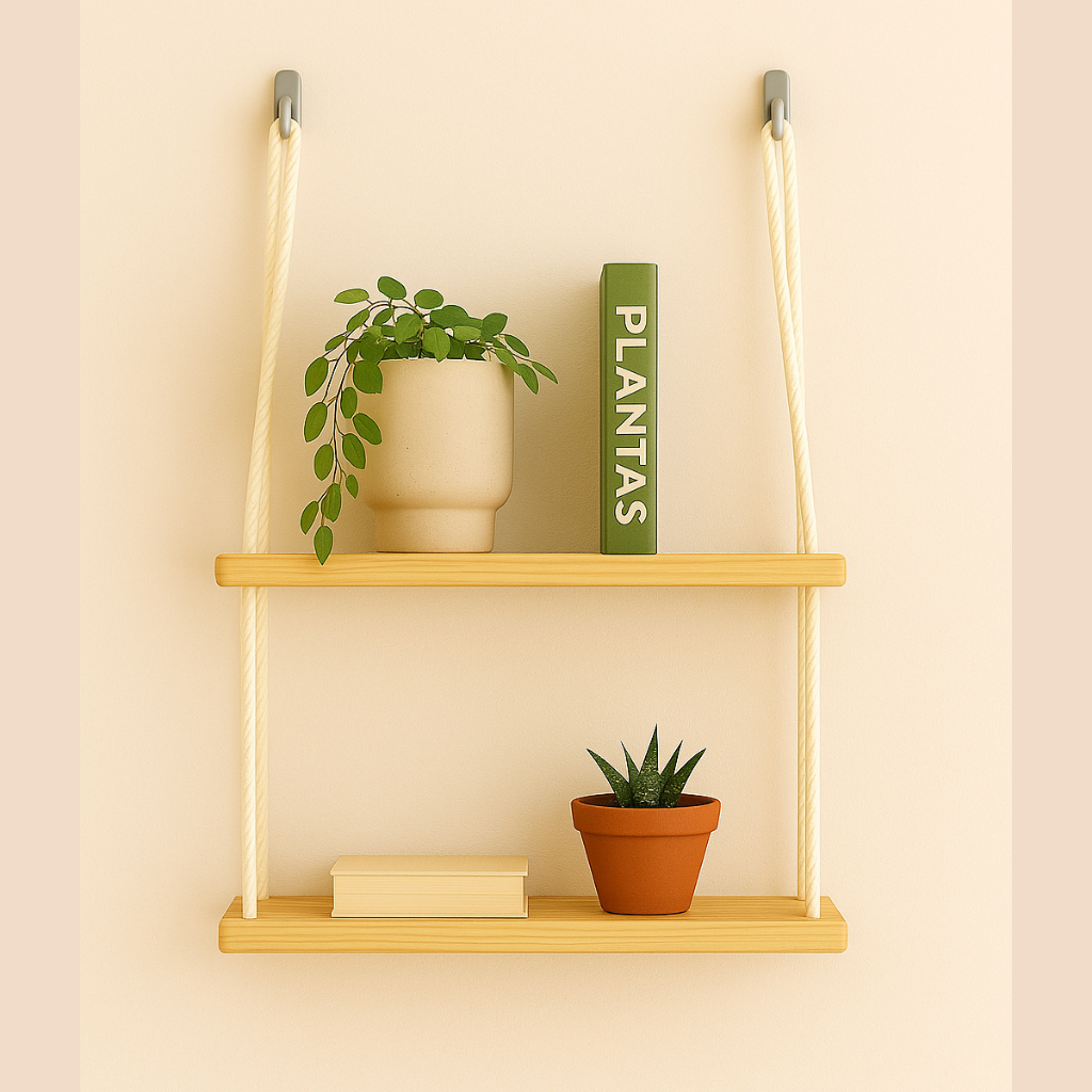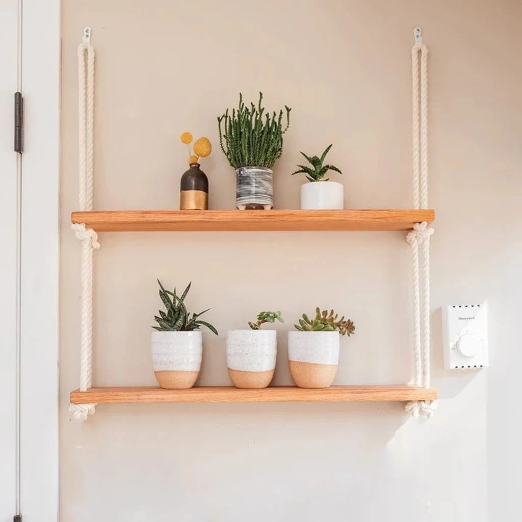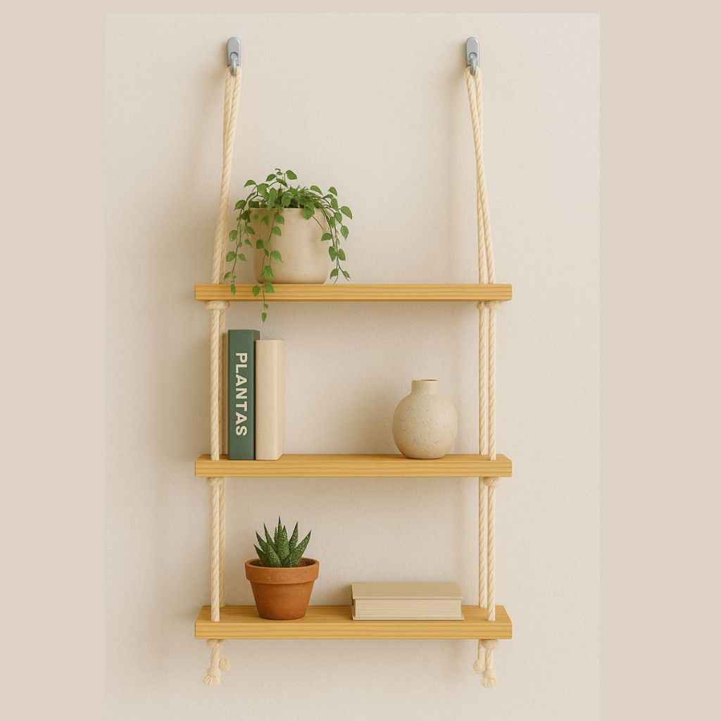 Prateleira de Madeira Suspensa com Cordas Nicho Decorativo